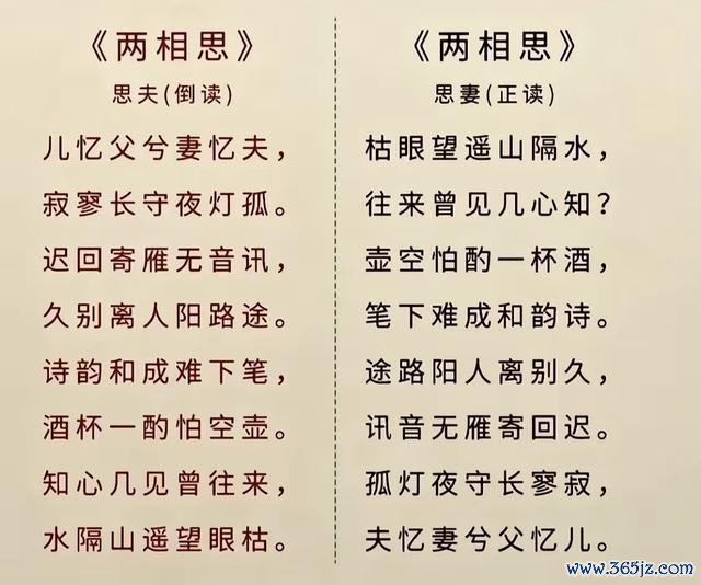 这首诗无需改动一字,正着读是丈夫漂泊在外,对妻儿的深切思念,名曰《思妻诗》;倒着读,便瞬间转换视角,成了家中妻子独守空闺,对丈夫的殷殷牵挂,名曰《思夫诗》,一首诗承载双向深情,合为《两相思》,把异地相守的牵挂与孤寂,写到了极致。